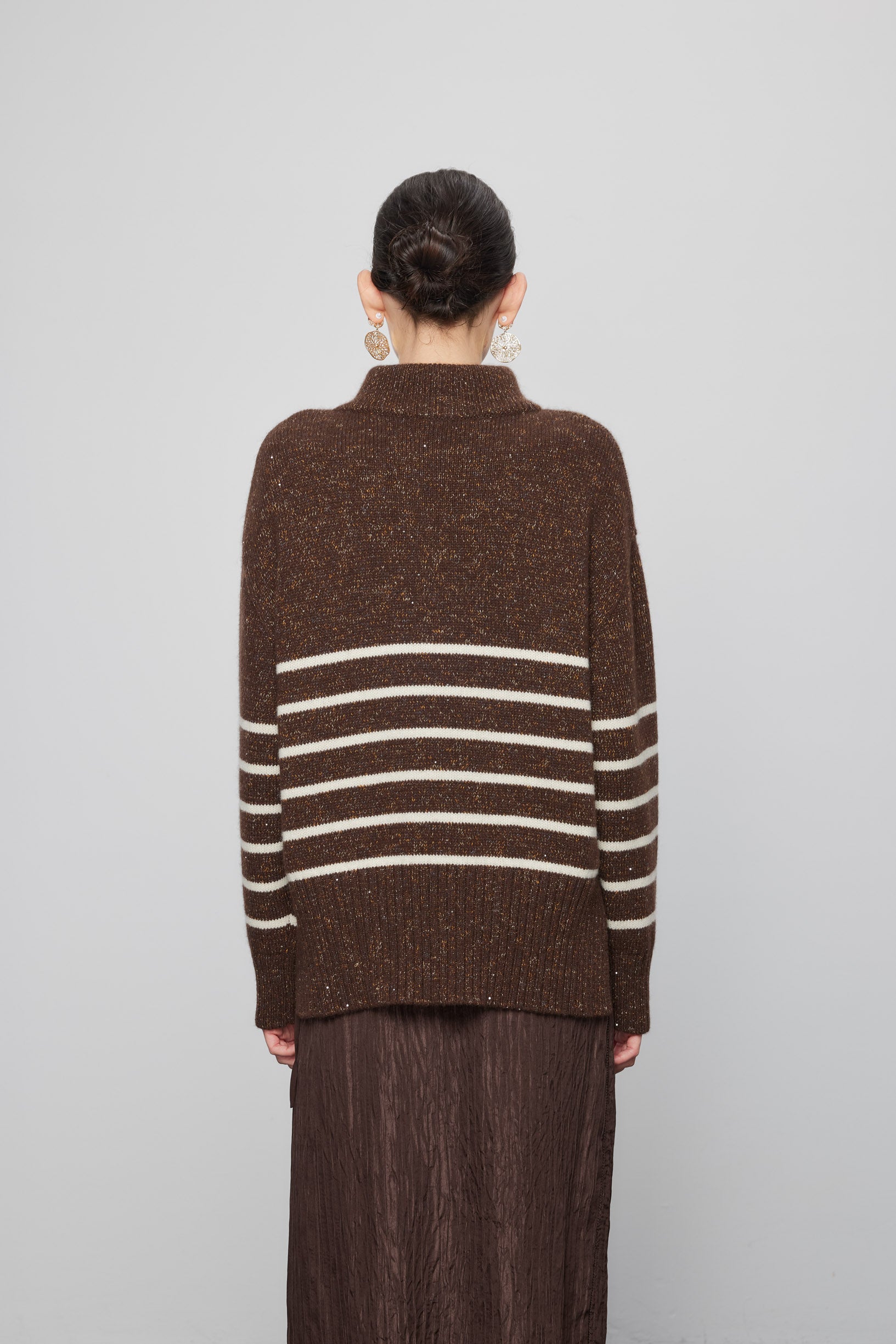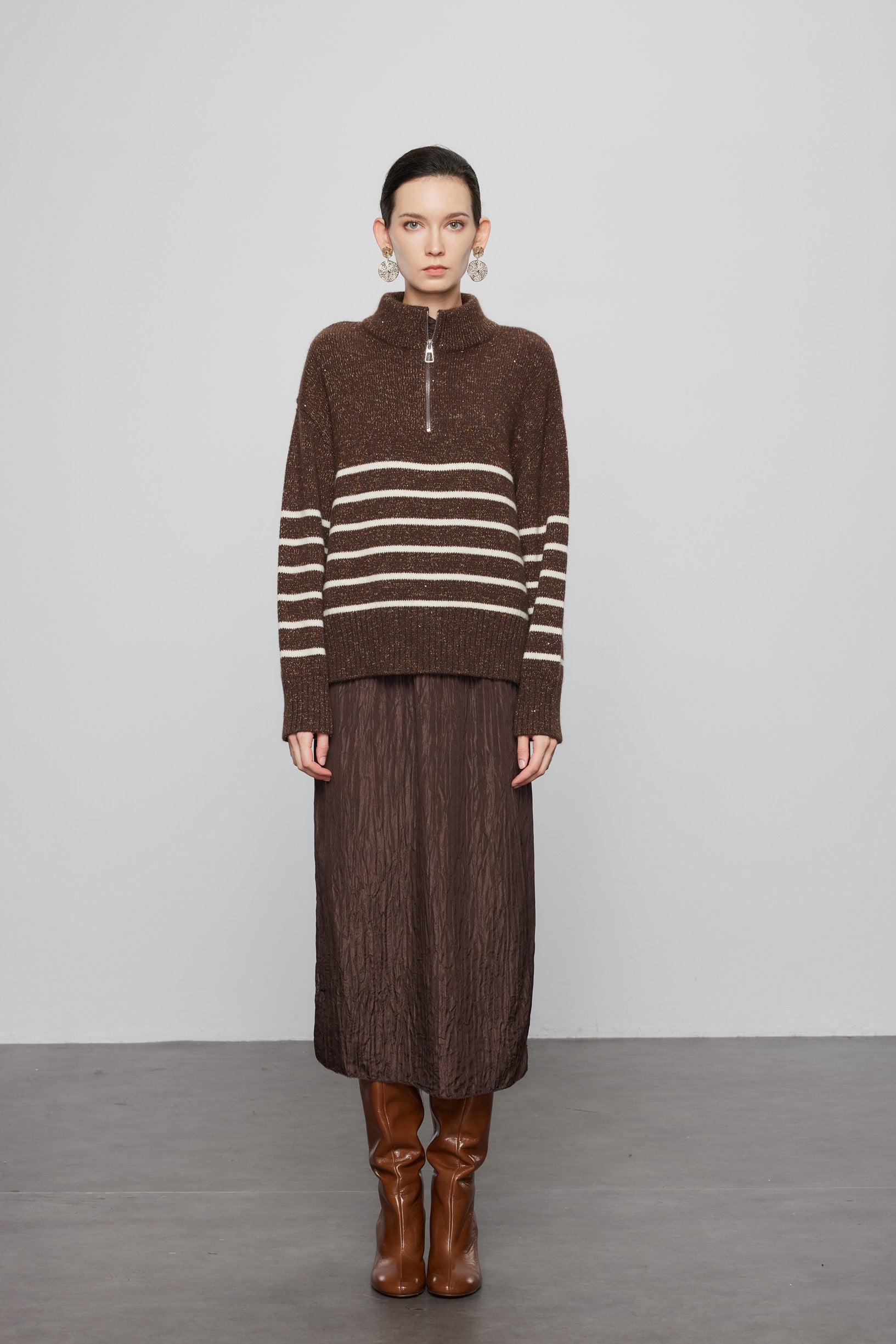 This contemporary half-zip sweater combines rare yak wool and merino wool with metallic thread accents for subtle luminosity. The technical blend offers lightweight warmth with enhanced durability, featuring a streamlined silhouette and ribbed trims for clean definition.